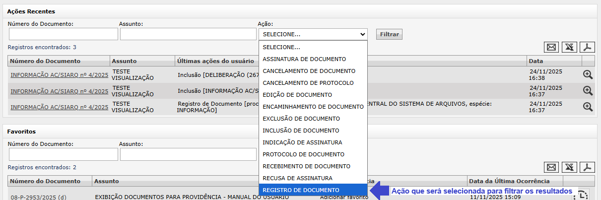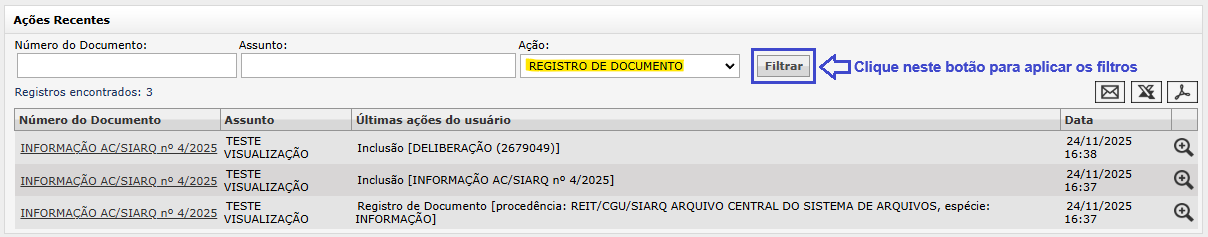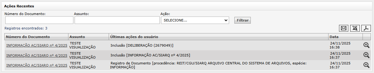 - Número do Documento: informe um número de documento para consultar as ações que foram executadas especificamente nele.