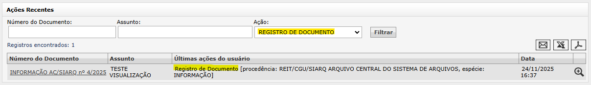 Na imagem anterior, o usuário logado possui apenas três ações recentes. Mas, para exemplificar, pesquisaremos apenas pelas ocorrências de Registro de Documento, conforme imagens a seguir: