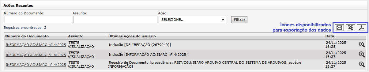 Acima da seção "Ações Recentes, o sistema disponibiliza ícones para exportação dos dados, conforme imagem a seguir: