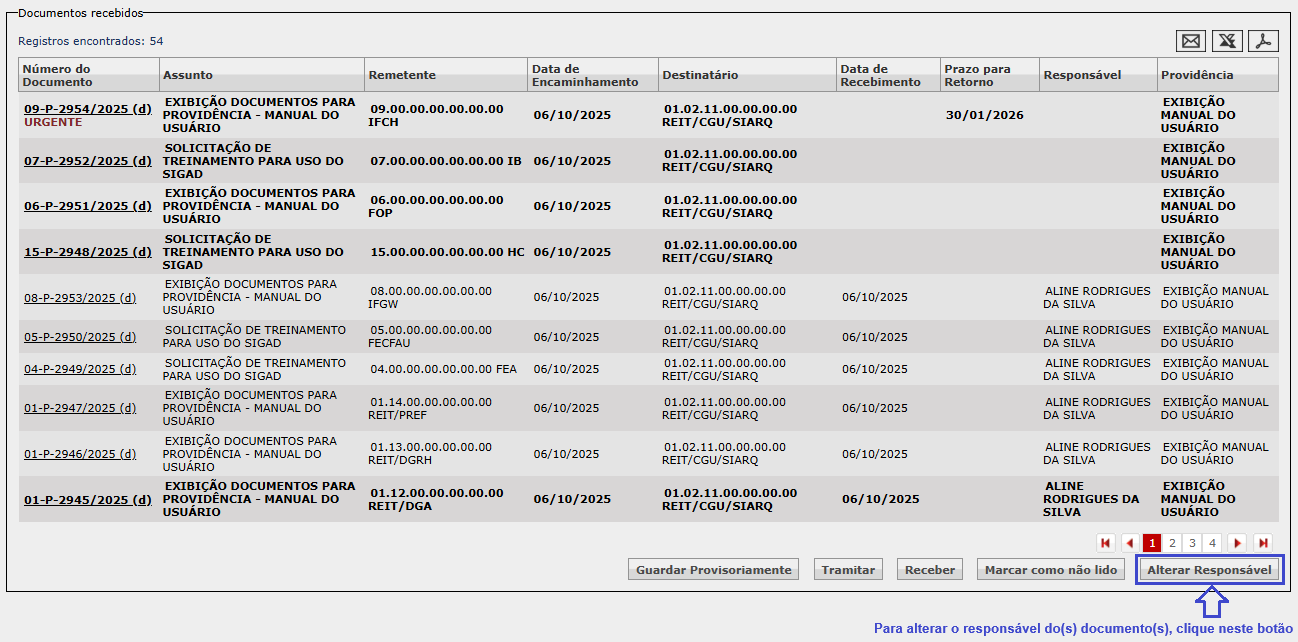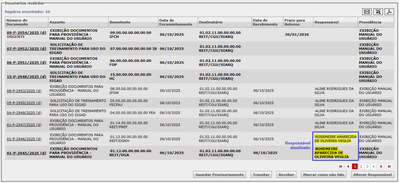 No caso da alteração de responsável, todos os documentos são passíveis de seleção, inclusive aqueles pendentes de recebimento.
