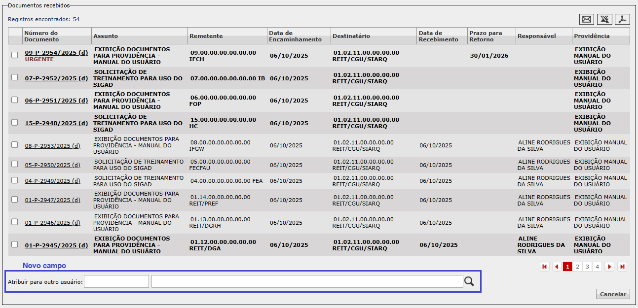 Selecione os documentos desejados e, depois, preencha o campo "Atribuir para outro usuário", em destaque na imagem anterior. Se souber a matrícula do usuário que será o novo responsável pelos documentos selecionados, informe-a no primeiro campo (o menor) e tecle Enter; o nome será automaticamente preenchido no segundo campo (o maior). Se não souber a matrícula, pode digitar qualquer parte do nome do usuário no segundo campo e teclar Enter para realizar a pesquisa. Se preferir, pode clicar direto na lupa e realizar a pesquisa.