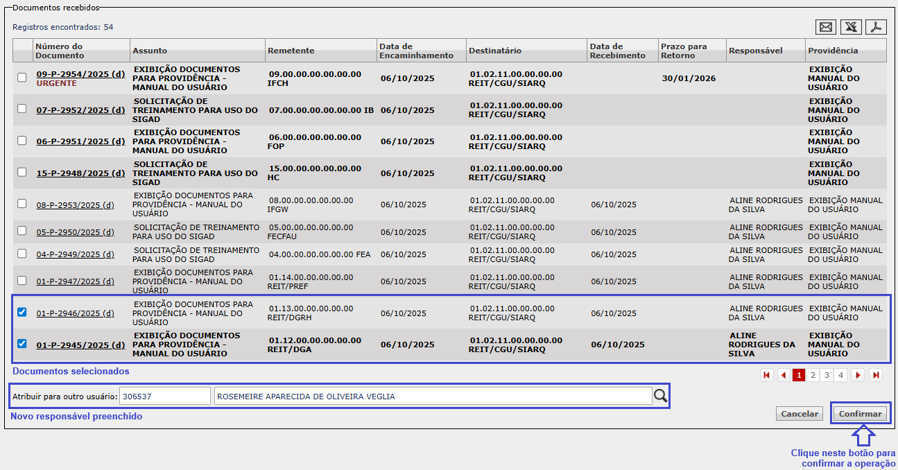 Após selecionar os documentos e informar o novo usuário responsável, clique em Confirmar: