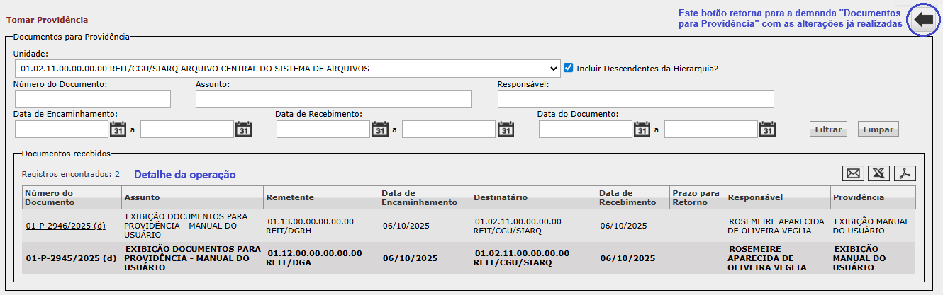 Ao clicar em Voltar, botão em destaque na imagem anterior, o sistema retorna para a tela inicial da demanda "Documentos para Providência", com as alterações já realizadas.
