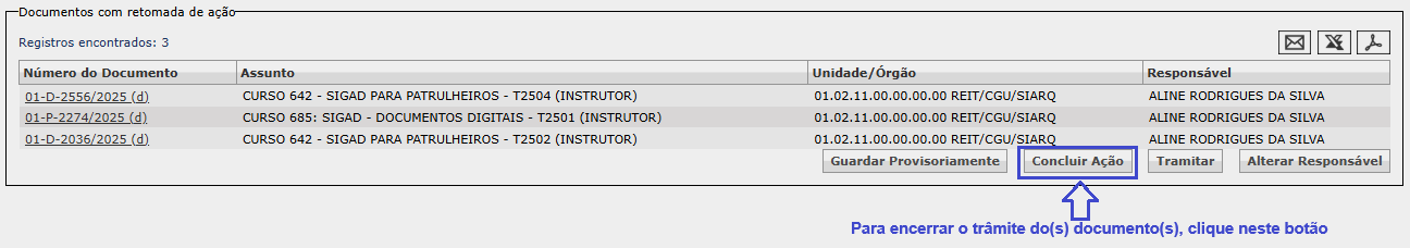 Para encerrar o trâmite (concluir ação) de documentos, clique no botão "Concluir Ação", conforme imagem a seguir: