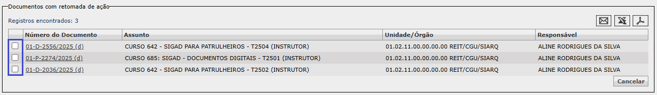 O botão "Cancelar" desfaz as seleções e retorna para a tela inicial da demanda "Documentos para Providência".