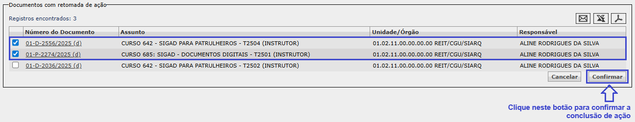 Selecione os documentos que deseja concluir a ação e, depois, clique em Confirmar: