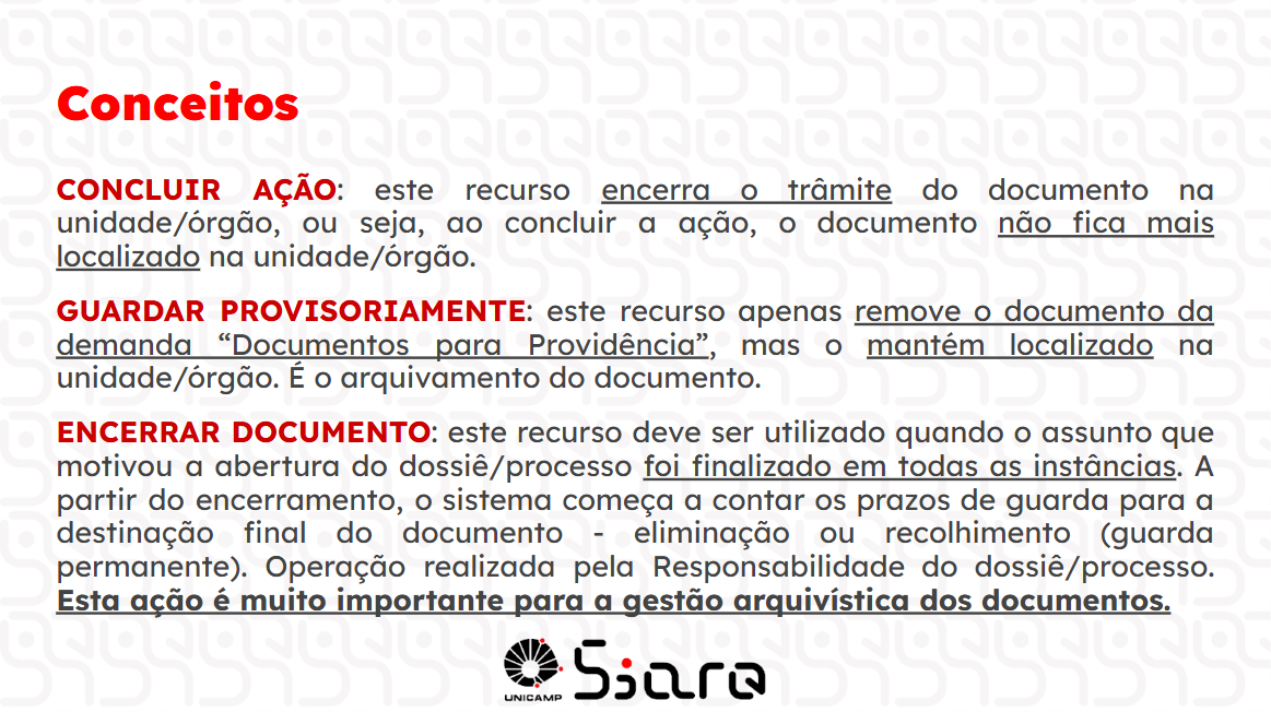 Conforme mencionado anteriormente, a conclusão de ação remove a localização da unidade/órgão do(s) documento(s). Não se trata do encerramento do documento ou do arquivo (guarda provisória).