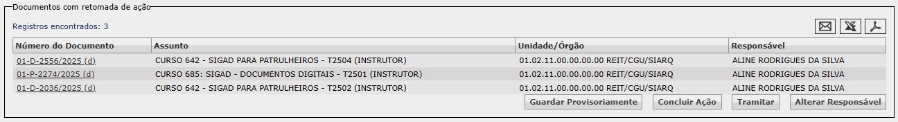 Nesta seção, o sistema lista todos os documentos digitais (dossiês e processos) que a unidade indicada na tela inicial (e/ou seus códigos descendentes, quando houver) retomou a ação. A retomada de ação só é permitida em documentos que já tramitaram naquele código.