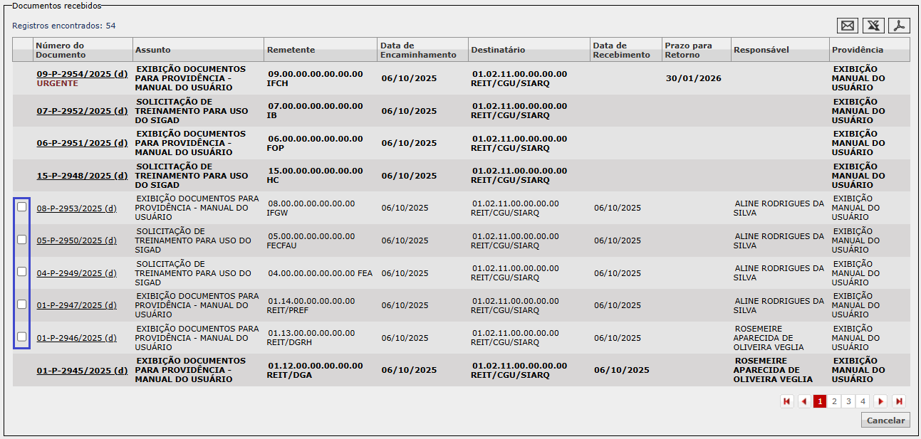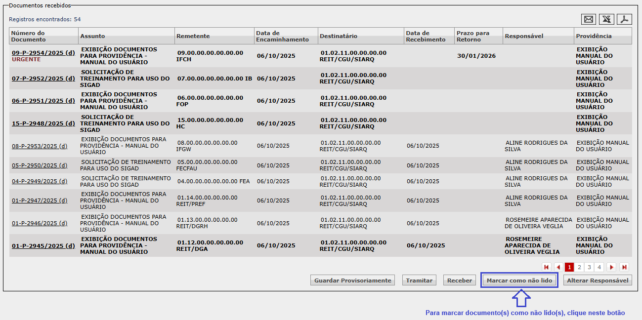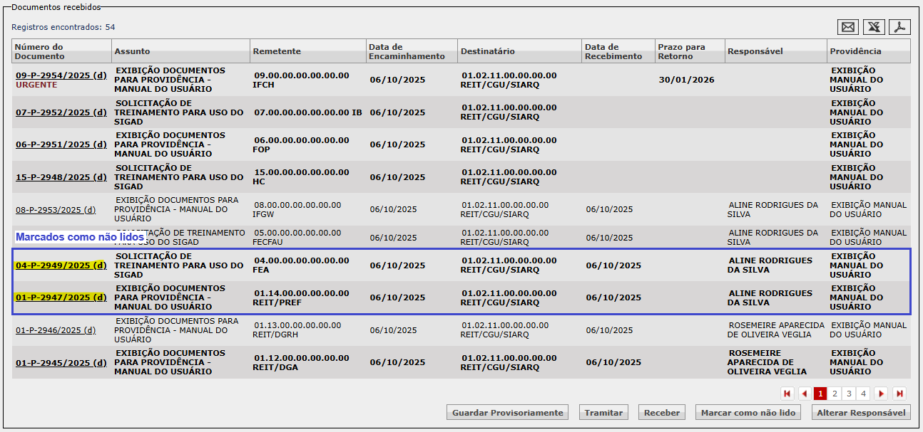 2) O sistema não habilitou os documentos que já estão marcados como não lidos, como é o caso do último documento da página 1, o 01-P-2945/2025 (observe que ele possui uma Data de Recebimento, portanto, o negrito é da marcação como não lido).