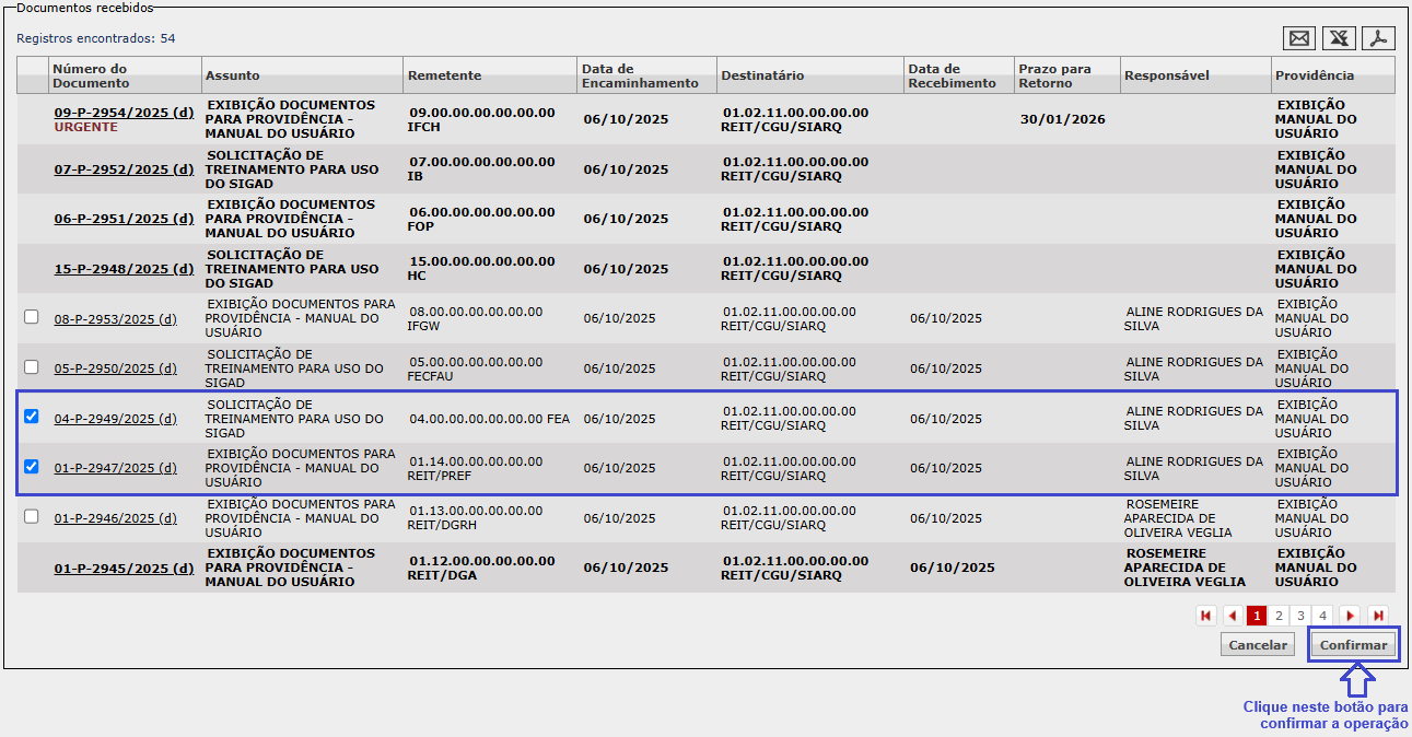 Selecione os documentos desejados e, depois, clique em Confirmar: