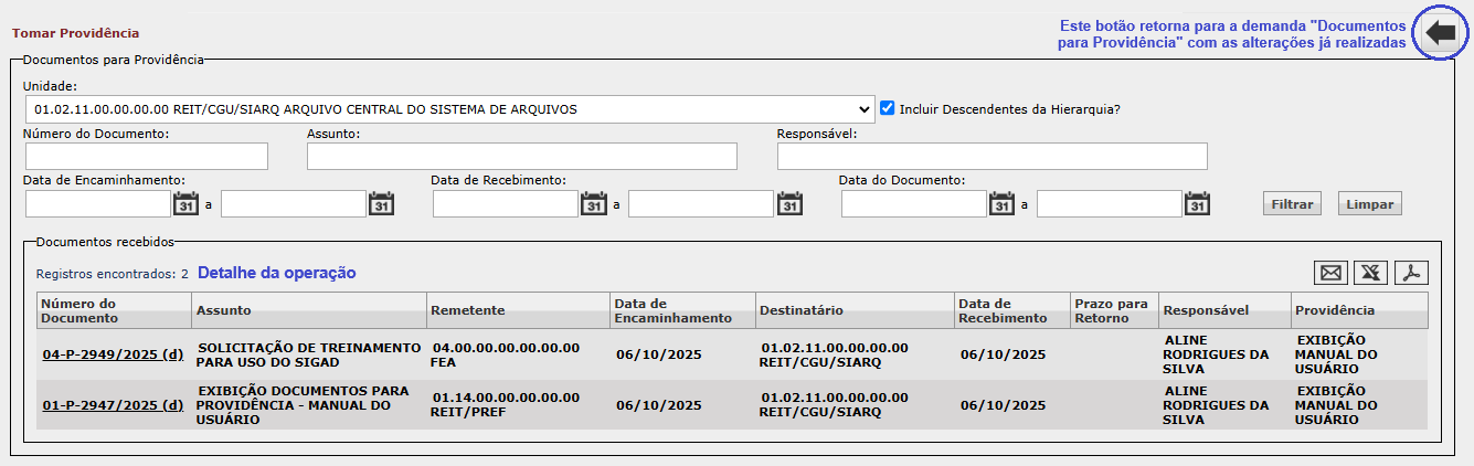 Ao clicar em Voltar, botão em destaque na imagem anterior, o sistema retorna para a tela inicial da demanda "Documentos para Providência", com as alterações já realizadas.