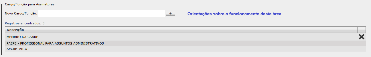 Caso seja necessário excluir algum cargo/função inserido manualmente, basta clicar no ícone X correspondente.