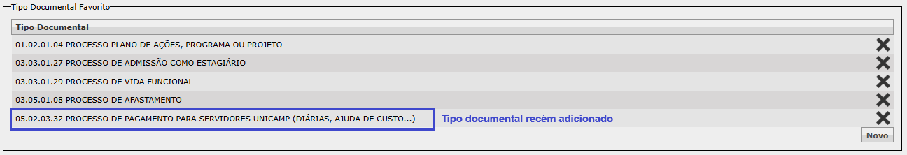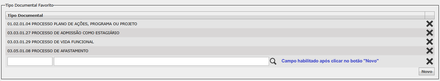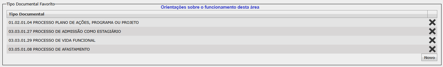 Observação: em caso de novo usuário ou usuário que não costuma protocolar documentos, é possível que esta área esteja em branco, ou seja, sem nenhum tipo documental listado. Neste caso, só é possível adicionar um novo tipo, através do botão "Novo".