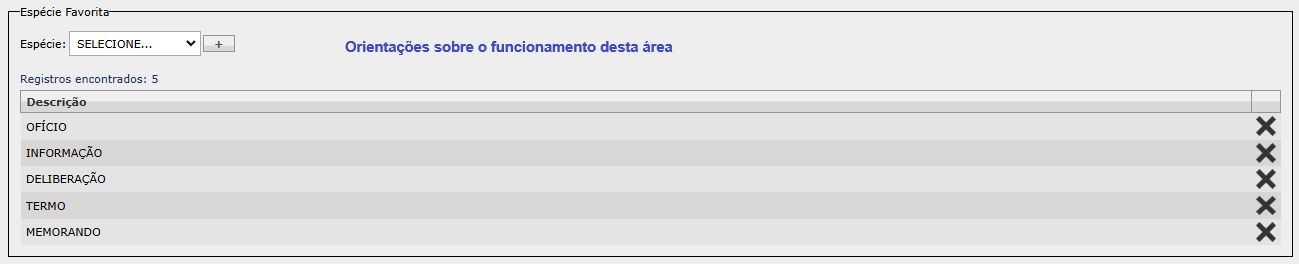 Observação: em caso de novo usuário ou usuário que não costuma produzir, registrar ou protocolar documento avulso, é possível que esta área esteja em branco, ou seja, sem nenhuma espécie listada.
