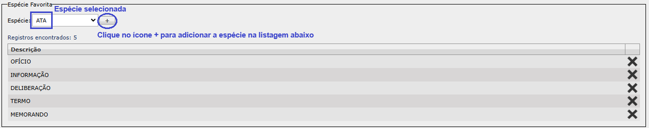 Na produção e no registro de atos administrativos e também no protocolo de documentos avulsos, o campo "Espécie" é de preenchimento obrigatório. Nestas operações, o SIGAD consulta esta informação de duas formas: através dos Favoritos ou de uma busca geral. Esta consulta de "Favoritos" é incrementada de duas formas: 1) pelo usuário, cadastrando suas espécies mais utilizadas diretamente no Perfil do Usuário; e 2) pelo sistema, de forma automática, caso seja identificado o uso de uma determinada espécie com certa frequência.