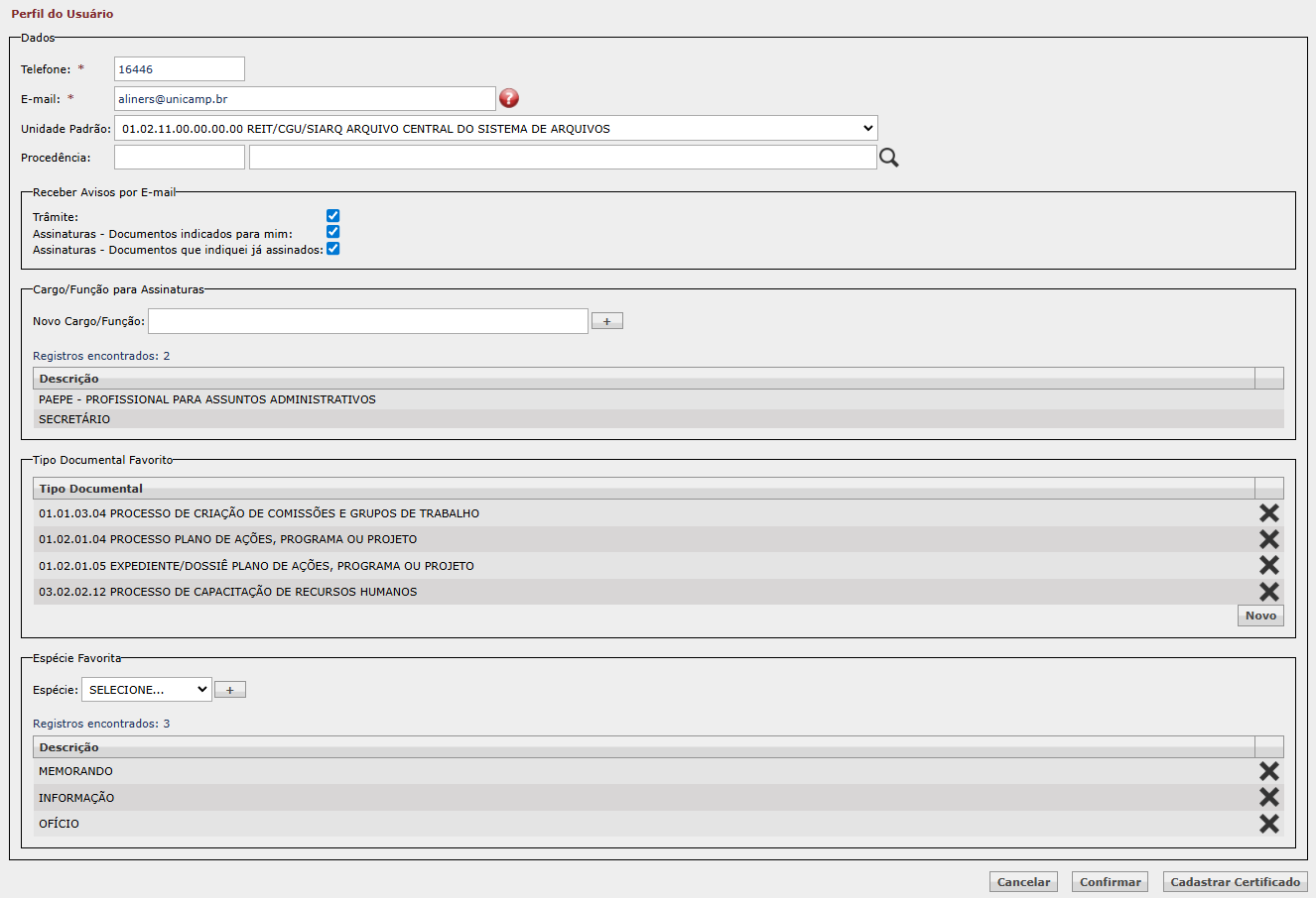 Por padrão, todas as opções vêm selecionadas, conforme imagem anterior. Portanto, o usuário só precisa fazer alterações caso não queira receber algum tipo de notificação. Neste caso, basta desmarcar o tipo de notificação desejado e confirmar as alterações. Da mesma forma, caso o usuário deseje ser notificado novamente, basta acessar o Perfil do Usuário, selecionar o tipo de notificação desejado e confirmar a operação.